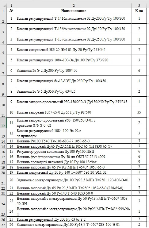 2) Клапан регулирующий Т-136бм исполнение 02 Ду150 Ру/Ту 100/450 -2шт 3) Клапан регулирующий Т-137бм исполнение 02 Ду250 Ру/Ту 100/300 -1шт 4) Клапан импульсный 586-20-ЭМ-01 Ду 20 Ру/Ту 255/545 -7шт 5) Клапан регулирующий 1084-100-Эа Ду100 Ру/Ту 373/280 -3шт 6) Задвижка 2с-Э-2 Ду200 Ру/Ту 100/450 -6шт 7) Клапан регулирующий 6с-13-5ЭЧ Ду 250 Ру/Ту 100/450 -1шт 8) Задвижка 2с-Э-5 Ду350 Ру/Ту 63/425 -2шт 9) Клапан запорно-дроссельный 950-150/250-Э Ду150/250 Pу/Ту 255/545 -1шт 10) Клапан запорный 1057-65-0 Ду65 Ру/Ту 98/540 -35шт 11) "Клапан запорно- дроссельный 950- 150/250-Э-01 с приводом 876-Э-0- 02" -2шт 12) "Клапан регулирующий 1084-100-Эа-02 с эл.приводом" -3шт 13) Вентиль Ру100 Т540 Ту-108-680-77 1057-65-0 -3шт 14) Вентиль запорный Ду65 Ру23,5МПа 1052-65-ЭН (838-65-Э) -3шт 15) Регулятор уровня конденсата Ду100 Ру100 ПВД -6шт 16) Вентиль фут.фторопластом Ду 50 мм ОКП.37.2213.4009 -6шт 17) Вентиль проходной цапковый Ду 10 Ру 100 15с9бк -9шт 18) Вентиль запорный Ду 65 Ру 9,8 МПа Т=540* 1057-65-0 -2шт 19) Клапан импульсный Ду 20 Ру 140 Т=560* 586-20-ЭМ-02 -1шт 20) Задвижка с электроприводом Ду100 Ру23,5 МПа Т=250 1120-100-Э-01 -2шт 21) Вентиль запорный Ду 65 Ру 23,5 МПа Т=250* 1052-65-0 (838-65-0) -7шт 22) Вентиль запорный Ду 50 Ру140 Т-540 1053-50-0 -2шт 23) Вентиль запорный с электроприводом Ду 50 Ру13,7МПа Т=560* 1053-50-ЭН -3шт 24) Вентиль запорный с электроприводом Ду 20 Ру25 МПа Т=545* 999-20-Э -1шт 25) Клапан регулирующий Ду 200 Ру 63 6с-8-2 -2шт 26) Задвижка с электроприводом Ду100 Ру13,7 Т=560* 883-100-Э-01 -2шт |