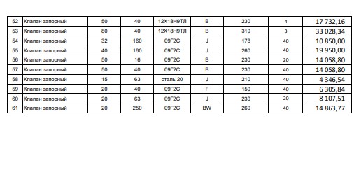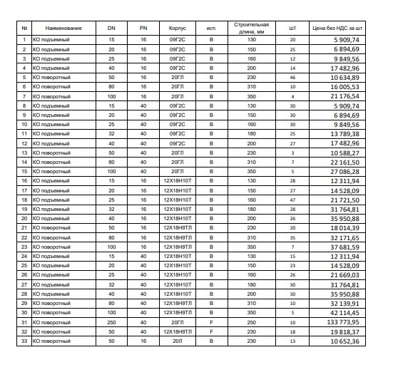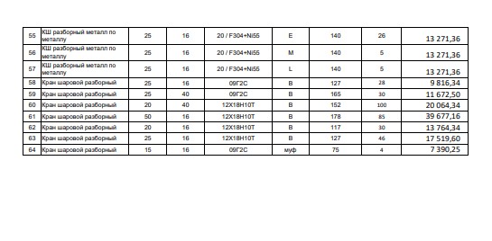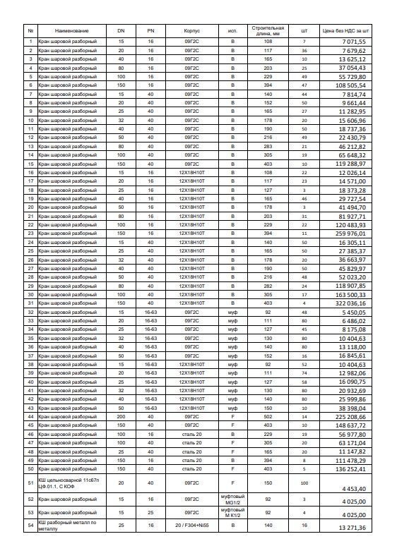 Кран шаровой фланцевый Ду250 Ру16 ALSO –4 шт. Кран шаровой фланцевый Ду25 Ру25 АрмКомплектСервис –21 шт. Кран шаровой фланцевый Ду25 Ру25 АрмКомплектСервис с редуктором и пневмоприводом AIR Torque AT351 S08A F07/F10-N-L-22–2 шт. Кран шаровой фланцевый Ду100 Ру25 АрмКомплектСервис –4 шт. Кран шаровой фланцевый Ду150 Ру16 IDMAR с электроприводом Actuator HQ-050–3 шт. Кран шаровой фланцевый Ду150 Ру25 IDMAR с электроприводом Actuator HQ-050–1 шт. Кран шаровой фланцевый Ду15 Ру16 САЗ ст.09г2с–23 шт. Кран шаровой фланцевый Ду150 Ру16 Маршал полнопроходной на пар–4 шт. Кран шаровой фланцевый Ду200 Ру25 Маршал полнопроходной–4 шт. Кран шаровой фланцевый Ду25 Ру16 Клапан Комплект –37 шт. Кран шаровой фланцевый Ду32 Ру16 Клапан Комплект –15 шт. Кран шаровой фланцевый Ду25 Ру16 ФОБОС–11 шт. Кран шаровой фланцевый Ду100 Ру16 ФОБОС–5 шт. Кран шаровой фланцевый Ду100 Ру16 ФОБОС ст.09г2с–4 шт. Кран шаровой фланцевый полнопроходной Ду100 Ру25 Бивал – 8 шт. Кран шаровой фланцевый Ду150 Ру16 с редуктором КВО-АРМ–39 шт. Кран шаровой фланцевый Ду15 Ру16 Ярдос (ЗАРД 015.016.21-00Р)–259 шт. Кран шаровой фланцевый Ду15 Ру16 Сателлит–40 шт. Кран шаровой фланцевый Ду15 Ру40 Сателлит–31 шт. Кран шаровой фланцевый Ду20 Ру16 Сателлит ст. 09г2с –31 шт. Кран шаровой фланцевый Ду25 Ру63 Сателлит–12 шт. Кран шаровой фланцевый Ду40 Ру16 Сателлит ст.09г2с–9 шт. Кран шаровой фланцевый полнопроходной Ду50 Ру16 Сателлит–4 шт. Кран шаровой фланцевый Ду50 Ру16 Сателлит ст.09г2с–6 шт. Кран шаровой фланцевый Ду50 Ру16 Гирас полнопроходной, ст.09Г2С – 14 шт. Кран шаровой фланцевый Ду50 Ру63 Гирас ст.09Г2С – 7 шт. Кран шаровой фланцевый ПТ39180-200 Ду200 Ру100 полнопроходной, ст.09Г2С, (ПТ39180-200) с редуктором и рубашкой обогрева Пенза – 1шт. Кран шаровой фланцевый полнопроходной Ду100 Ру25 LD – 6 шт. Кран шаровой фланцевый Ду25 Ру16 УЗПА–51 шт. Кран шаровой фланцевый Ду25 Ру16 Июсю–66 шт. Кран шаровой фланцевый Ду50 Ру16 ВНИЛ–17 шт. Кран шаровой фланцевый химический КШХ Ду100 Ру16 Элмон–3 шт. Кран шаровой межфланцевый КШТВГ Ду15 Ру16 Автоматика Инвест–125 шт. Кран шаровой под приварку Ду20 Ру40 Naval–120 шт. Кран шаровой под приварку Ду200 Ру16 Naval–7 шт. Кран шаровой под приварку с редуктором Ду250 Ру25 Vexve–15 шт. Кран шаровой под приварку Ду100 Ру25 Danfoss–11 шт. Кран шаровой под приварку Ду100 Ру25 ЛД (LD)–35 шт. Кран шаровой под приварку Ду200 Ру16 ЛД (LD)–5 шт. Кран шаровой приварной Ду150 Ру80 ст.09г2с полнопроходной ВАРК–1 шт. Кран шаровой под приварку Ду15 Ру63 САЗ–18 шт. Кран шаровой под приварку регулирующий Ду100 Ру25 LD REGULA–3 шт. Кран шаровой под приварку регулирующий Ду100 Ру25 Naval Trim–7 шт. Кран шаровой под приварку регулирующий Ду80 Ру25 Stensel Trim–11 шт. Кран шаровой под приварку регулирующий Ду100 Ру25 Stensel Trim–9 шт. Кран шаровой штуцерный Ду20 Ру160 Ярдос–6 шт. Кран шаровой штуцерный Ду6 Ру16 Сателлит ст.09г2с–22 шт. Кран шаровой штуцерный Ду6 Ру16 Сателлит–11 шт. Кран шаровой муфтовый Ду25 Ру40 УЗТА–52 шт. Кран шаровой муфтовый Ду6 Ру40 ЗАРДП 006.040.10-00.Р Ярдос–136 шт. Кран шаровой муфтовый Ду10 Ру160 Ярдос–19 шт. Кран шаровой муфтовый трехходовой Ду15 Ру25 Ярдос ст.09г2с–59 шт. Кран шаровой муфтовый Ду20 Ру160 Ярдос–15 шт. Кран шаровой муфтовый Ду40 Ру100 Ярдос–6 шт. Кран шаровой муфтовый Ду50 Ру100 Ярдос–3 шт. Кран шаровой муфтовый Ду15 Ру160 Маяк–107 шт. Кран шаровой муфтовый Ду20 Ру160 Маяк–49 шт. Кран шаровой муфтовый Ду20 Ру40 LD – 62 шт. Кран шаровой муфтовый Ду25 Ру40 LD–53 шт. Кран шаровой муфтовый Ду50 Ру40 LD – 10 шт. Кран шаровой муфтовый Ду15 Ру16 Сателлит ст.09г2с–49 шт. Кран шаровой муфтовый Ду15 Ру63 