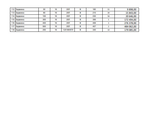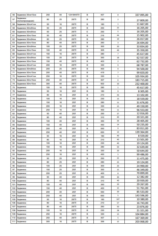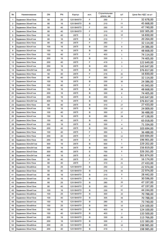 Цены договорные!!! Все вопросы на почту promtehno196@mail.ru НОВОЕ ПОСТУПЛЕНИЯ! ЗАДВИЖКА 30Ч915БР Ду500 Ру10 17шт 220.000тыс ЗАДВИЖКА 30Ч915БР Ду600 Ру10 10шт 310.000тыс ЗАДВИЖКА 30Ч915БР Ду800 Ру10 5шт 600.000тыс Задвижки 30с41нж Ду50 Ру16- 300шт 4300р Ду80 Ру16- 300шт 6100р Ду100 Ру16- 110шт 8200р Ду150 Ру16- 80шт 14500р Ду200 Ру16- 50шт 23000р Ду250 Ру16-20шт 38000р Ду300 Ру16-20шт 50000р Задвижка 30нж41нж Ру16 Ду50 ст.12Х18Н9ТЛ 17.100р 30шт Задвижка 30нж41нж Ру16 Ду80 ст.12Х18Н9ТЛ 28.200р 30шт Задвижка 30нж41нж Ру16 Ду100 ст.12Х18Н9ТЛ 35.000р 30шт Задвижка 30нж41нж Ру16 Ду150 ст.12Х18Н9ТЛ 72.800р 20шт Задвижка 30нж41нж Ру16 Ду200 ст.12Х18Н9ТЛ 120.000р 5шт Задвижка 30нж41нж Ру16 Ду250 ст. 12Х18Н9ТЛ 190.000р 5шт Задвижка 30нж41нж Ру16 Ду300 ст.12Х18Н9ТЛ 280.000р 5шт Задвижка 30нж41нж Ру16 Ду50 70шт 11.700р Задвижка 30нж41нж Ру16 Ду80 70шт 18.500р Задвижка 30нж41нж Ру16 Ду100 70шт 24.000р Задвижка 30нж41нж Ру16 Ду125 10шт 33.500р Задвижка 30нж41нж Ру16 Ду150 30шт 44.000р Задвижка 30нж41нж Ру16 Ду200 20шт 74.000р Задвижка 30нж41нж Ру16 Ду250 10шт 120.000р Задвижка 30нж41нж Ру16 Ду300 10шт 175.000р 12х18н9тл Клапан 15НЖ65НЖ Ду15 Ру16 30шт 5100 Клапан 15НЖ65НЖ Ду20 Ру16 30шт 6100р Клапан 15НЖ65НЖ Ду25 Ру16 30шт 7100р Клапан 15НЖ65НЖ Ду32 Ру16 30шт 9700р Клапан 15НЖ65НЖ Ду50 Ру16 30шт 13300р Клапан 15НЖ65НЖ Ду80 Ру16 30шт 23700р Клапан 15НЖ65НЖ Ду100 Ру16 30шт 28000р Клапан 15НЖ65НЖ Ду150 Ру16 5шт 67000р 08х18н10л Клапан 15НЖ65НЖ Ду15 Ру16 60шт 3800р Клапан 15НЖ65НЖ Ду20 Ру16 60шт 4000р Клапан 15НЖ65НЖ Ду25 Ру16 60шт 4300р Клапан 15НЖ65НЖ Ду32 Ру16 60шт 6000р Клапан 15НЖ65НЖ Ду40 Ру16 60шт 7000р Клапан 15НЖ65НЖ Ду50 Ру16 80шт 9500р Клапан 15НЖ65НЖ Ду65 Ру16 20шт 14000р Клапан 15НЖ65НЖ Ду80 Ру16 80шт 17200р Клапан 15НЖ65НЖ Ду100 Ру16 80шт 20800р Клапан 15НЖ65НЖ Ду150 Ру16 17шт 43700р Клапан 15НЖ65НЖ Ду200 Ру16 5шт 67000р 12х18н9тл Клапан 15НЖ22НЖ Ду15 Ру40 30шт 5100р Клапан 15НЖ22НЖ Ду20 Ру40 30шт 6100р Клапан 15НЖ22НЖ Ду25 Ру40 30шт 7100р Клапан 15НЖ22НЖ Ду32 Ру40 30шт 9700р Клапан 15НЖ22НЖ Ду50 Ру40 30шт 13300р Клапан 15НЖ22НЖ Ду80 Ру40 30шт 23700р Клапан 15НЖ22НЖ Ду100 Ру40 30шт 28000р Клапан 15НЖ22НЖ Ду150 Ру40 8шт 67000р Задвижка 30с941нж Ру16 Ду80 30шт Задвижка 30с941нж Ру16 Ду100 30шт Задвижка 30с941нж Ру16 Ду150 30шт Задвижка 30с941нж Ру16 Ду200 10шт Задвижка 30с941нж Ру16 Ду250 10шт Задвижка 30с941нж Ру16 Ду300 8шт Задвижка 30с941нж Ру16 Ду400 30шт Задвижка 30с941нж Ру16 Ду500 12шт Задвижка 30с941нж Ру16 Ду600 5шт Задвижка 30с941нж Ру16 Ду800 2шт Задвижка 30с964нж Ру25 Ду400 30шт Задвижка 30с964нж Ру25 Ду500 10шт Задвижка 30с964нж Ру25 Ду600 5шт Задвижка 30с964нж Ру25 Ду800 2шт АКЦИЯ!!! Отвод 720х10 ст.20 90гр. ГОСТ 17375-2001 35000р Отвод 630х10 ст.20 90гр. ГОСТ 17375-2001 25000р Отвод 530х10 ст.20 90гр. ГОСТ 17375-2001 17000р Отвод 377х10 ст.20 90гр. ГОСТ 17375-2001 8300р Отвод 273х10 ст.20 90гр. ГОСТ 17375-2001 4300р Отвод 273х8 ст.20 90гр. ГОСТ 17375-2001 3800р Отвод 219х6 ст.20 90гр. ГОСТ 17375-2001 1900р 30с41нж Ду400 Ру16 155000,00 30с941нж Ду400 Ру16 160000,00 30с941нж Ду500 Ру16 260000,00 30с941нж Ду600 Ру16 410000,00 30с964нж Ду400 Ру25 165000,00 30с964нж Ду500 Ру25 275000,00 30с964нж Ду600 Ру25 445000,00 30с964нж Ду800 Ру25 960.000,00 НОВОЕ ПОСТУПЛЕНИЕ УЖЕ НА СКЛАДЕ!!! Клапан 588-10-0 Ду10 ру373 300шт 10200р Клапан 589-10-0 Ду10 ру250 400шт 10350р Клапан 998-20-0 Ду20 ру373 300шт 15200р Клапан 999-20-0 Ду20 ру250 400шт 15800р 12х18н9тл Клапан 15НЖ65НЖ Ду15 Ру16 30шт 5200р Клапан 15НЖ65НЖ Ду20 Ру16 30шт 6400р Клапан 15НЖ65НЖ Ду25 Ру16 30шт 7500р Клапан 15НЖ65НЖ Ду32 Ру16 30шт 10500р Клапан 15НЖ65НЖ Ду50 Ру16 30шт 14700р Клапан 15НЖ65НЖ Ду80 Ру16 30шт 25000р Клапан 15НЖ65НЖ Ду100 Ру16 30шт 30000р Клапан 15НЖ65НЖ Ду150 Ру16 5шт 68000р 08х18н10л Клапан 15НЖ65НЖ Ду15 Ру16 60шт 4800р Клапан 15НЖ65НЖ Ду20 Ру16 60шт 5600р Клапан 15НЖ65НЖ Ду25 Ру16 60шт 6050р Клапан 15НЖ65НЖ Ду32 Ру16 60шт 8000р Клапан 15НЖ65НЖ Ду40 Ру16 60шт 9150р Клапан 15НЖ65НЖ Ду50 Ру16 80шт 11000р Клапан 15НЖ65НЖ Ду65 Ру16 20шт 15100р Клапан 15НЖ65НЖ Ду80 Ру16 80шт 20500р Клапан 15НЖ65НЖ Ду100 Ру16 80шт 23600р Клапан 15НЖ65НЖ Ду150 Ру16 17шт 50000р Клапан 15НЖ65НЖ Ду200 Ру16 5шт 84500р 12х18н9тл Клапан 15НЖ22НЖ Ду15 Ру40 30шт 5600р Клапан 15