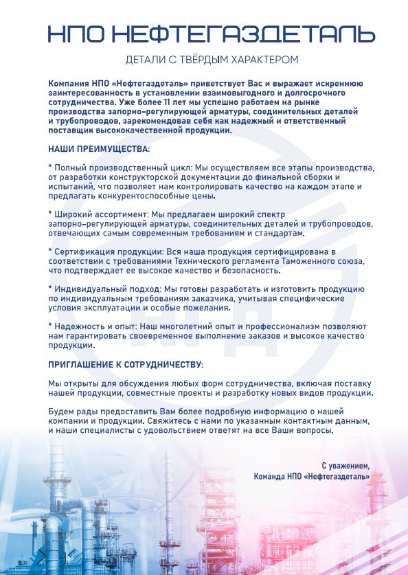 ООО НПО «Нефтегаздеталь» – отлично зарекомендовавшее себя предприятие с высокой динамикой развития, предлагающее комплексную поставку оборудования и комплектующих для нефтегазовой и машиностроительной отраслей собственного производства. В 2013 году специалистами компании было освоено производство фланцевых соединений, а также фланцевого крепежа, по широкому спектру нормативных документов, в том числе разработанных собственными силами, что открыло новые возможности на российском рынке. Фланцы и фланцевый крепеж широко применяются в ТЭК для строитетьства трубопровоов, газопроводов, в производстве арматуры, сосудов, соединительных частей трубопроводов. Широкая область применения делает фланец важной составляющей частью любого серьезного проекта в нефтегазовой отрасли. Сегодня НПО «Нефтегаздеталь» по праву заработала репутацию надежного поставщика высококачественной продукции для десятков предприятий, в том числе успешно прошла аудит в ПАО «СИБУР Холдинг» и аккредитацию в ПАО «Роснефть». Сотрудничает компания и с дочерними структурами «Газпрома» – в частности, в ООО «Газпром трансгаз Екатеринбург» активно используется оборудование с применением фланцев производства НПО «Нефтегаздеталь». Имеем возможность поставлять высококачественную запорную арматуру и детали трубопровода (переходы, тройники, отводы) производства ООО ПТЗ, АО БАЗ. Вся продукция сертифицирована. С уважением, Крежевских Регина Марсовна Специалист по продажам отдела СДТ ООО НПО "Нефтегаздеталь" сот 89279322776, почта 2210@ngd.su |