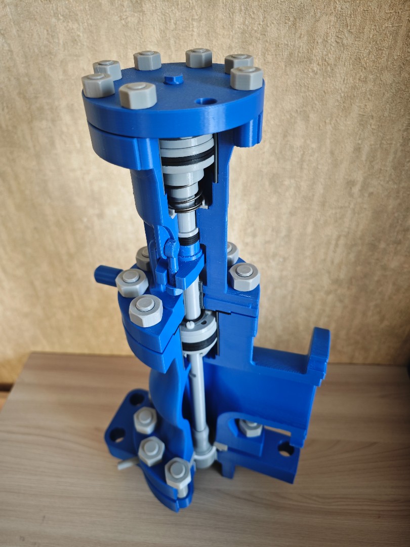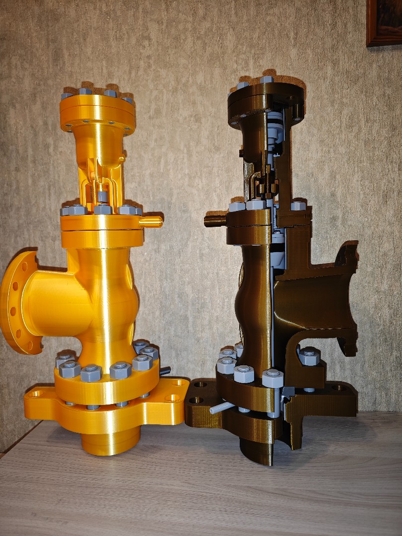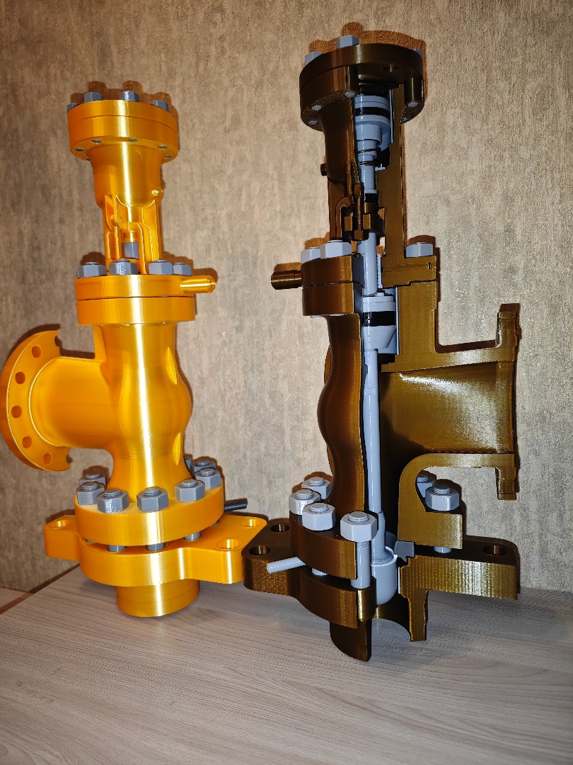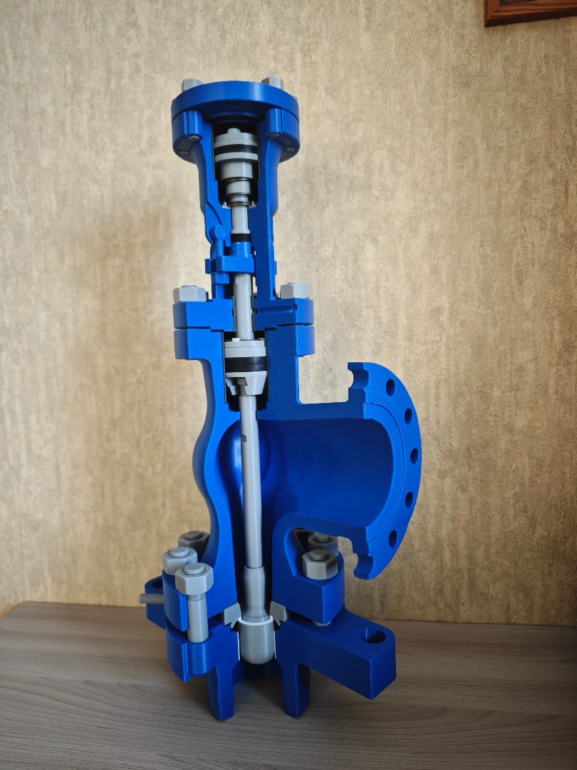 Макет клапана запорно дроссельного 950-150/250-Э с эл.приводом 876-Э-0-02 . изготовлен на 3d принтере все детали подвижные, клапан открывается и закрывается, размер 540*180*180мм. Можно применять как учебное пособие или как сувенир для энергетика. цена 8т.р