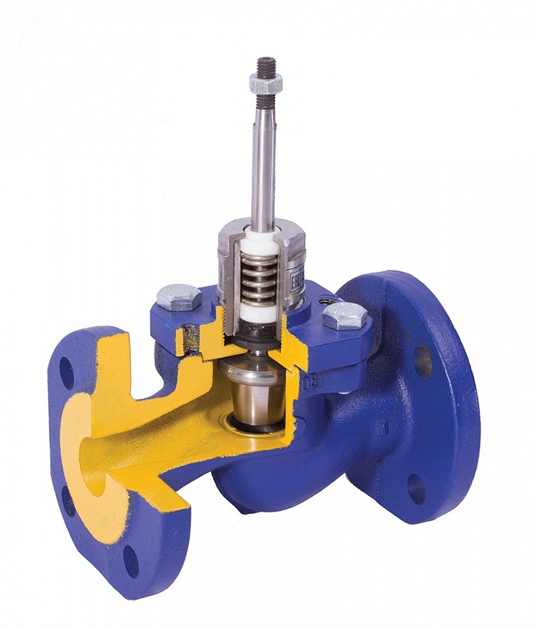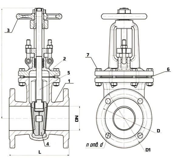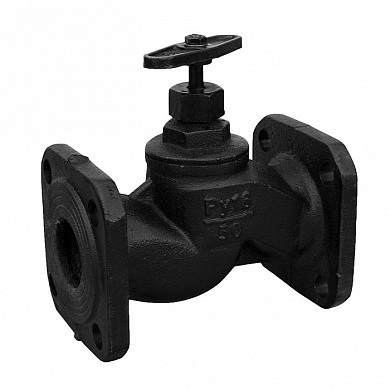Изделие состоит из литого корпуса с двумя вертикальными фланцами. Внутри корпуса есть посадочное место-кольцо под запорный элемент. На третий горизонтальный фланец, на паронитовую прокладку, устанавливается крышка, через которую проходит шпиндель, входящий в зацепление с золотником. С противоположной стороны шпиндель связан с маховиком. В верхней части крышки расположена сальниковая камера (набивка ТРГ), поджатая откидными болтами. Перекрывающим элементом в этом запорном клапане являются круглый золотник и кольцевое гнездо корпуса.